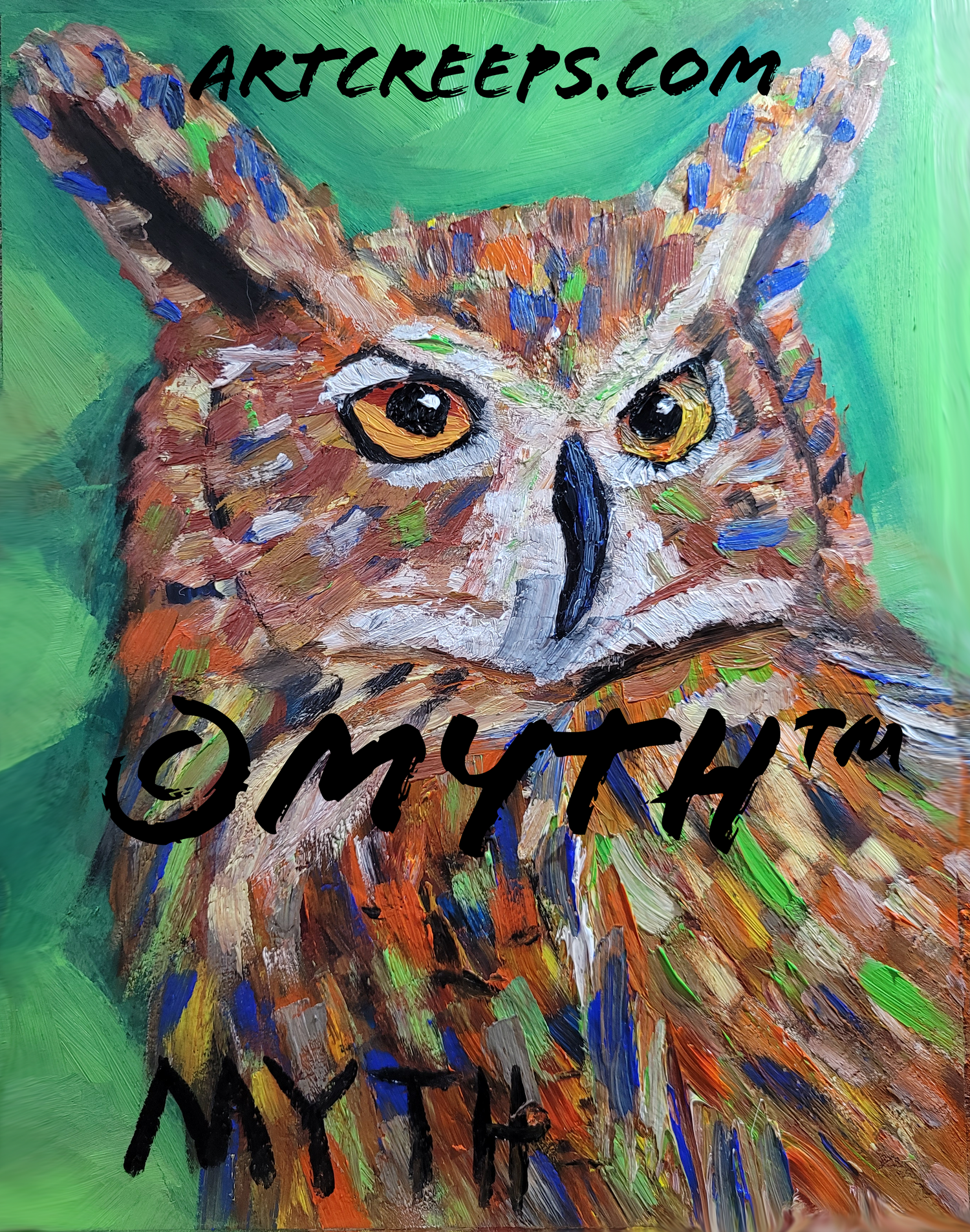 Original oil painting on wood, created with thick brushwork and bold texture. The piece features an owl in unusual, unique colors, forming a beautiful piece rendered in expressive, layered strokes, bringing depth to the piece. The piercing amber eyes are a stand-out feature of this painting. Eyes are a frequent stand-out feature in MYTH's wildlife paintings.